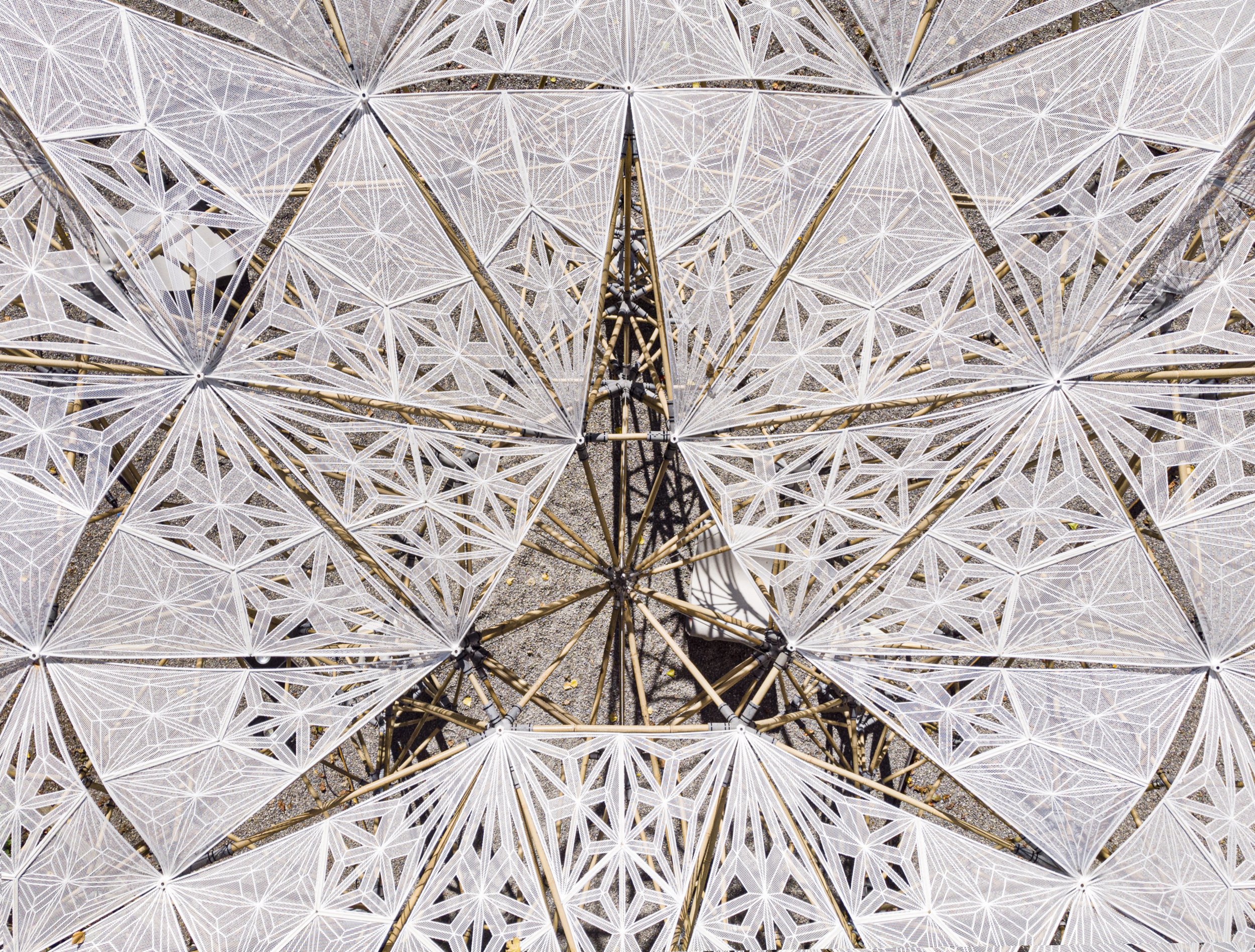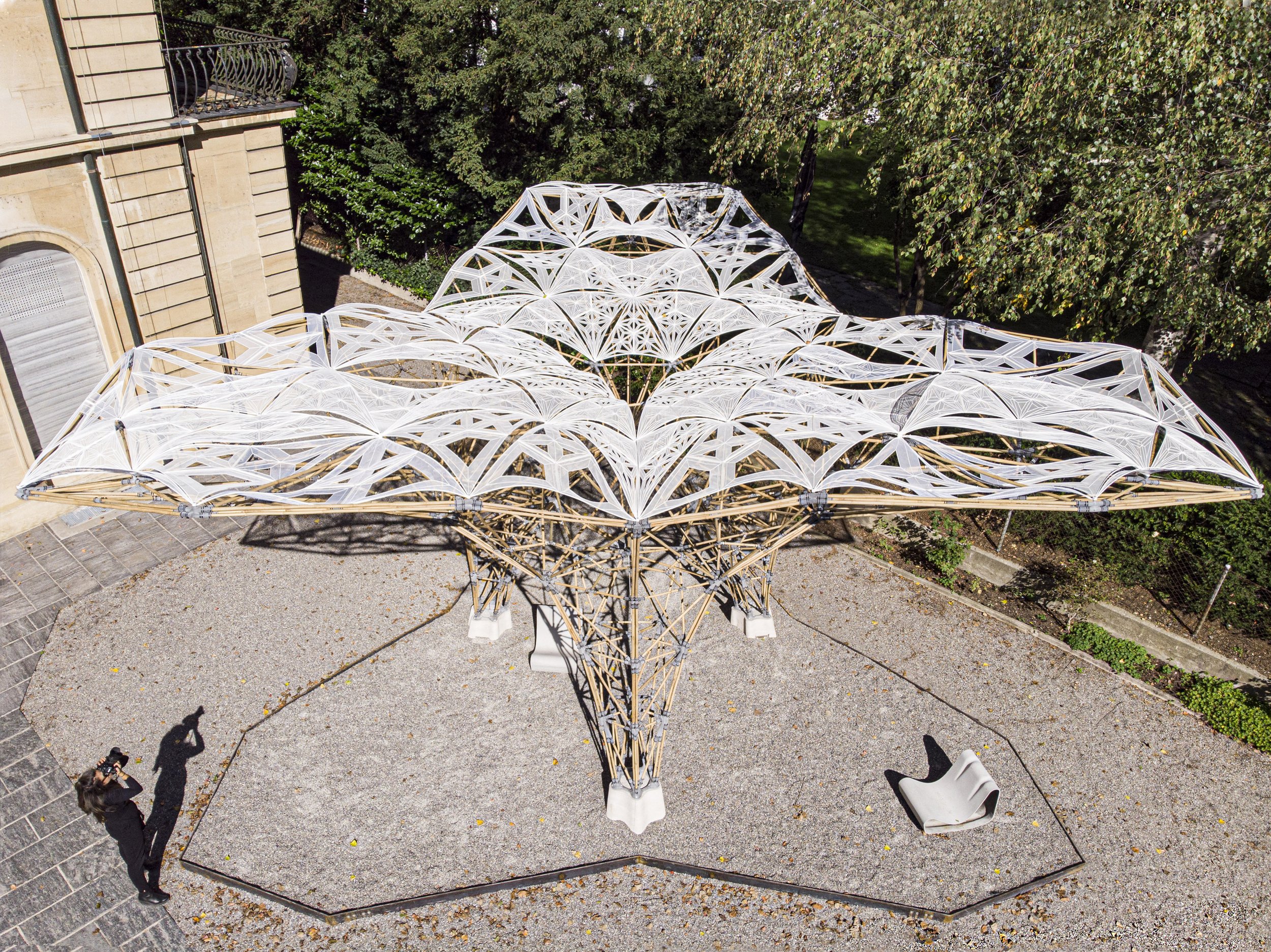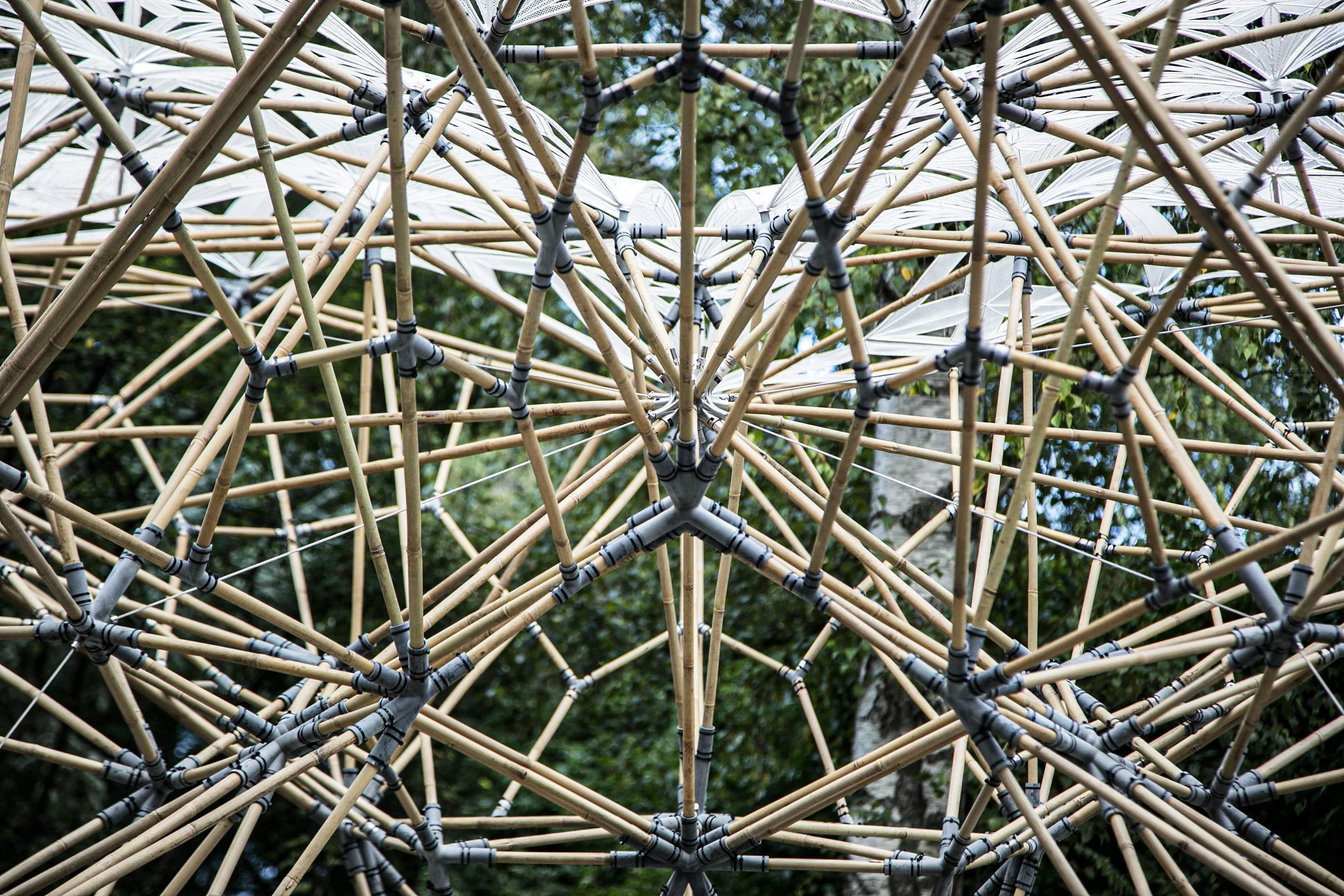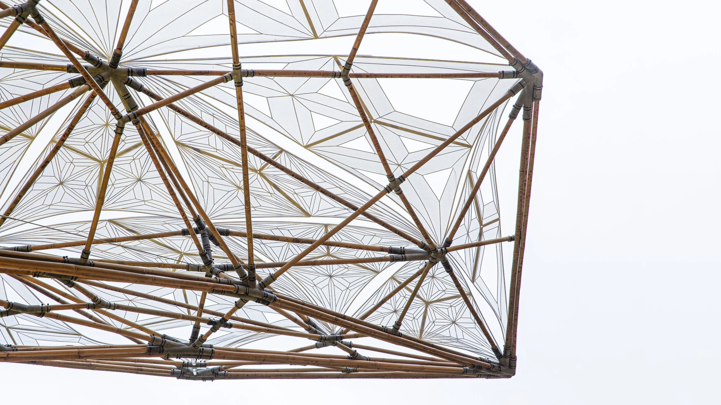 The spatial structure consists of over 900 bamboo elements arranged into a filigree truss system reinforced with post-tensioned cables. Its geometry was developed using custom form-finding tools that optimize load distribution and allow the pavilion to cantilever nearly five meters in three directions with minimal support. Computational design enabled both structural efficiency and formal exploration, resulting in a highly expressive, non-standard space frame that moves beyond conventional modular vocabularies.