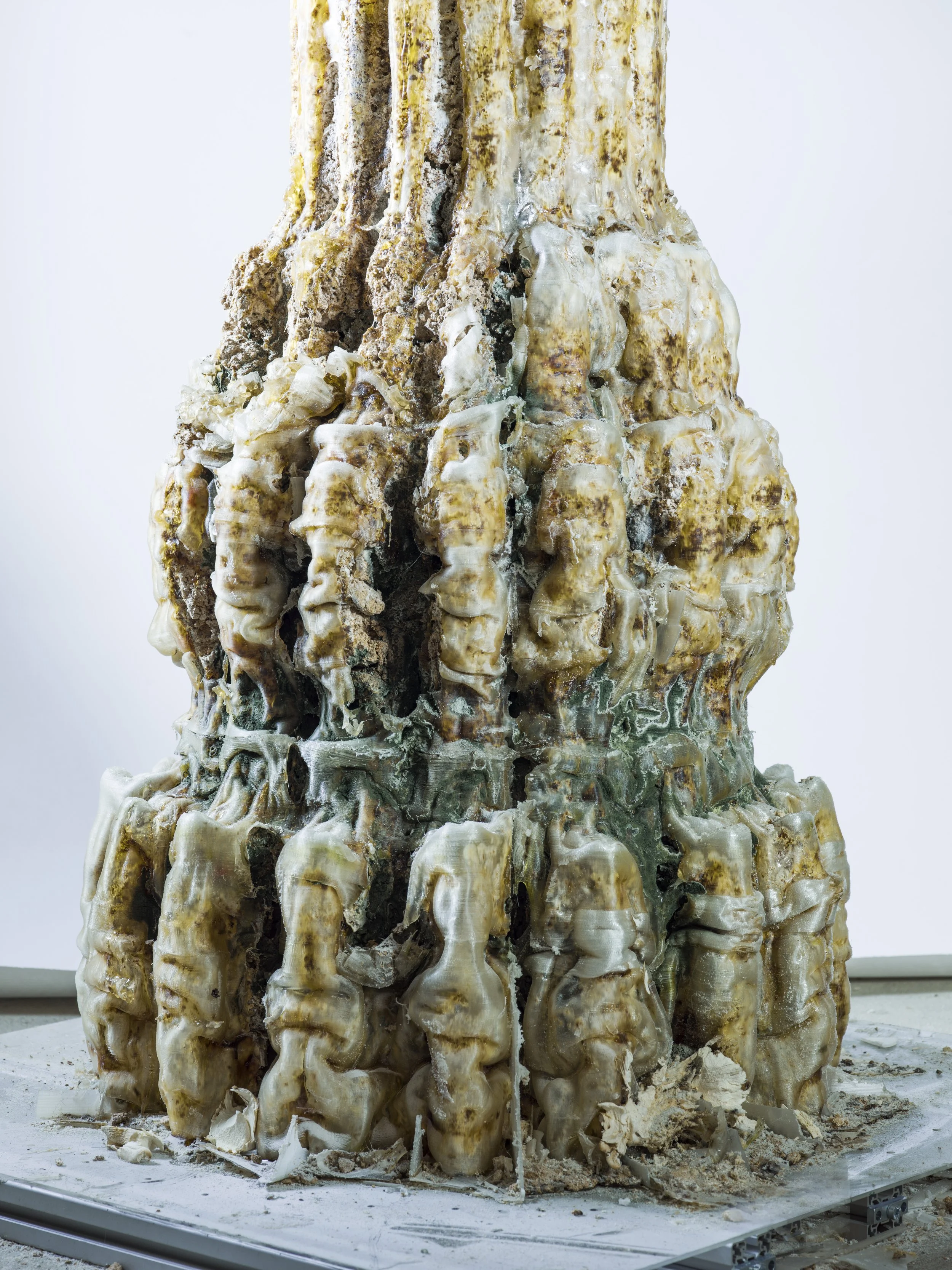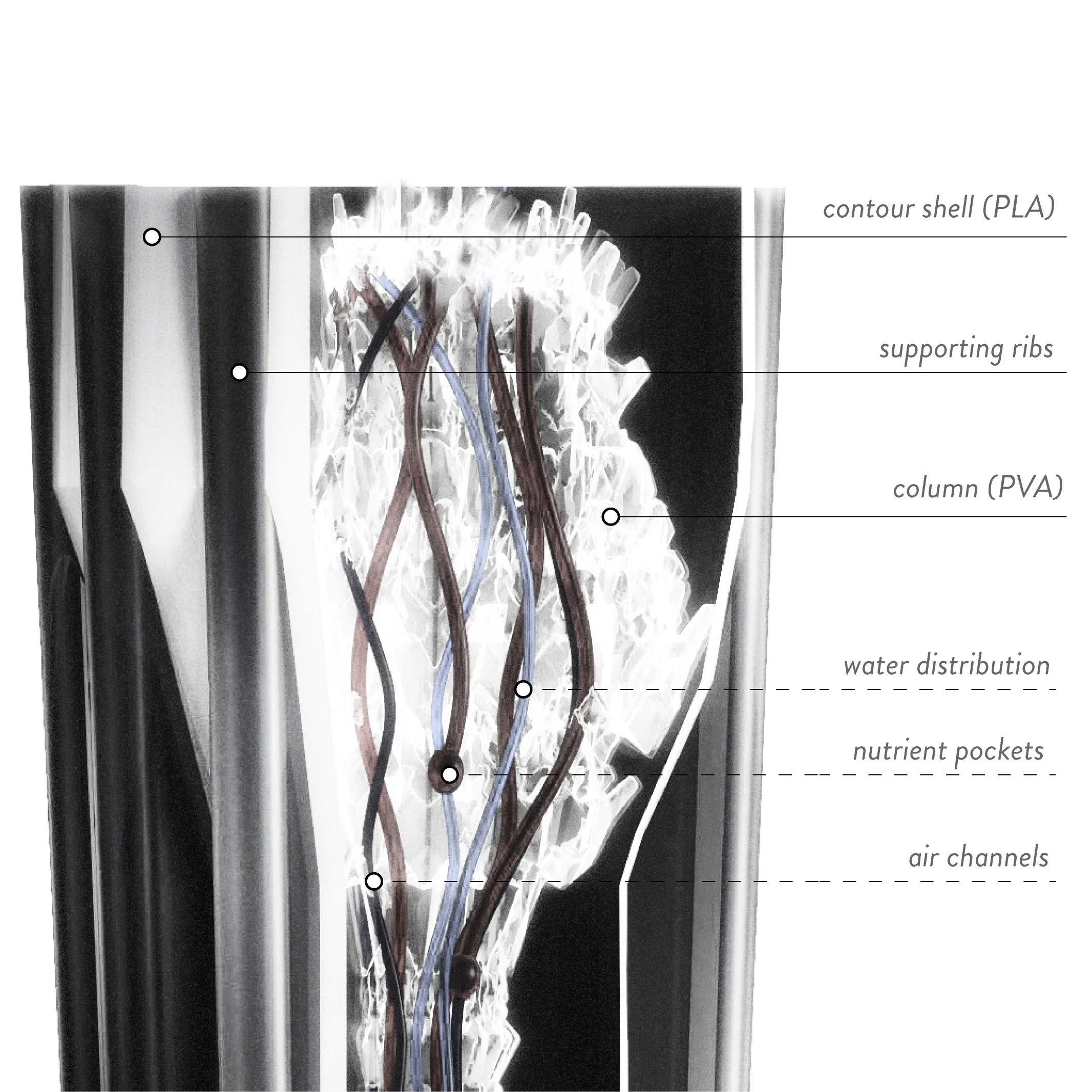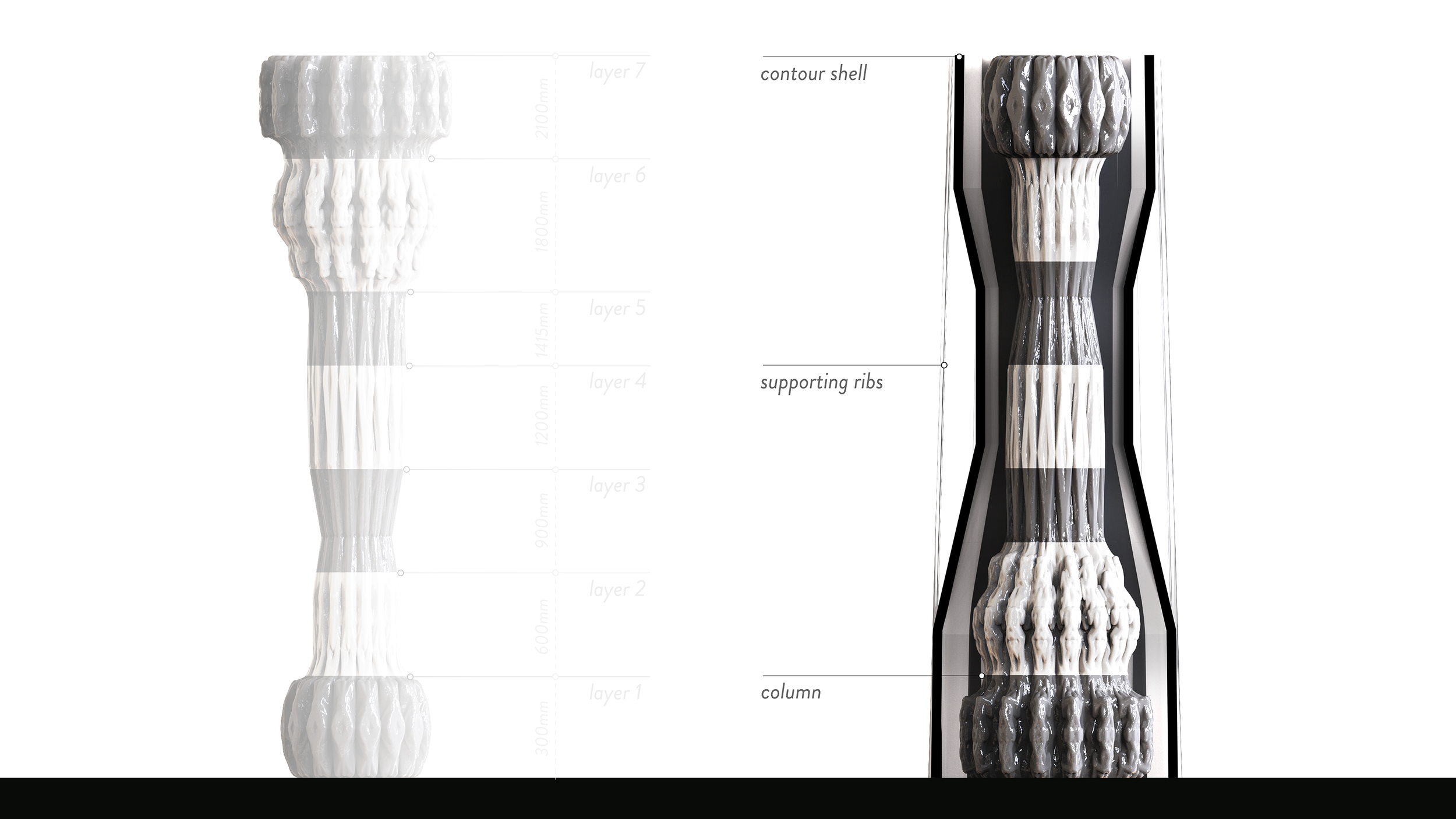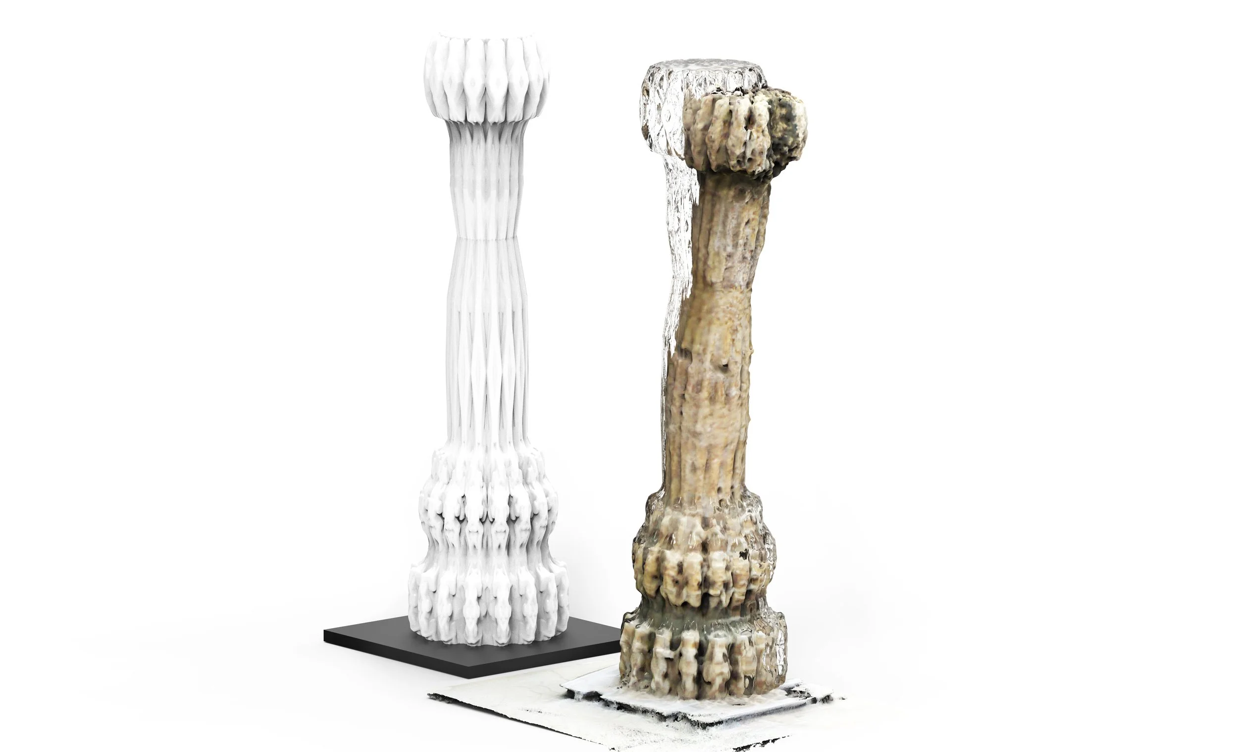 The Living Column is a full-scale architectural artifact grown from living biological material. Its geometry is defined by a highly engineered 3D printed formwork designed specifically to host, guide and support biological growth. The formwork, produced from a water-soluble polymer, acts as both a spatial mold and a micro-environment that facilitates the formation of a mycelium-bound biopolymer.