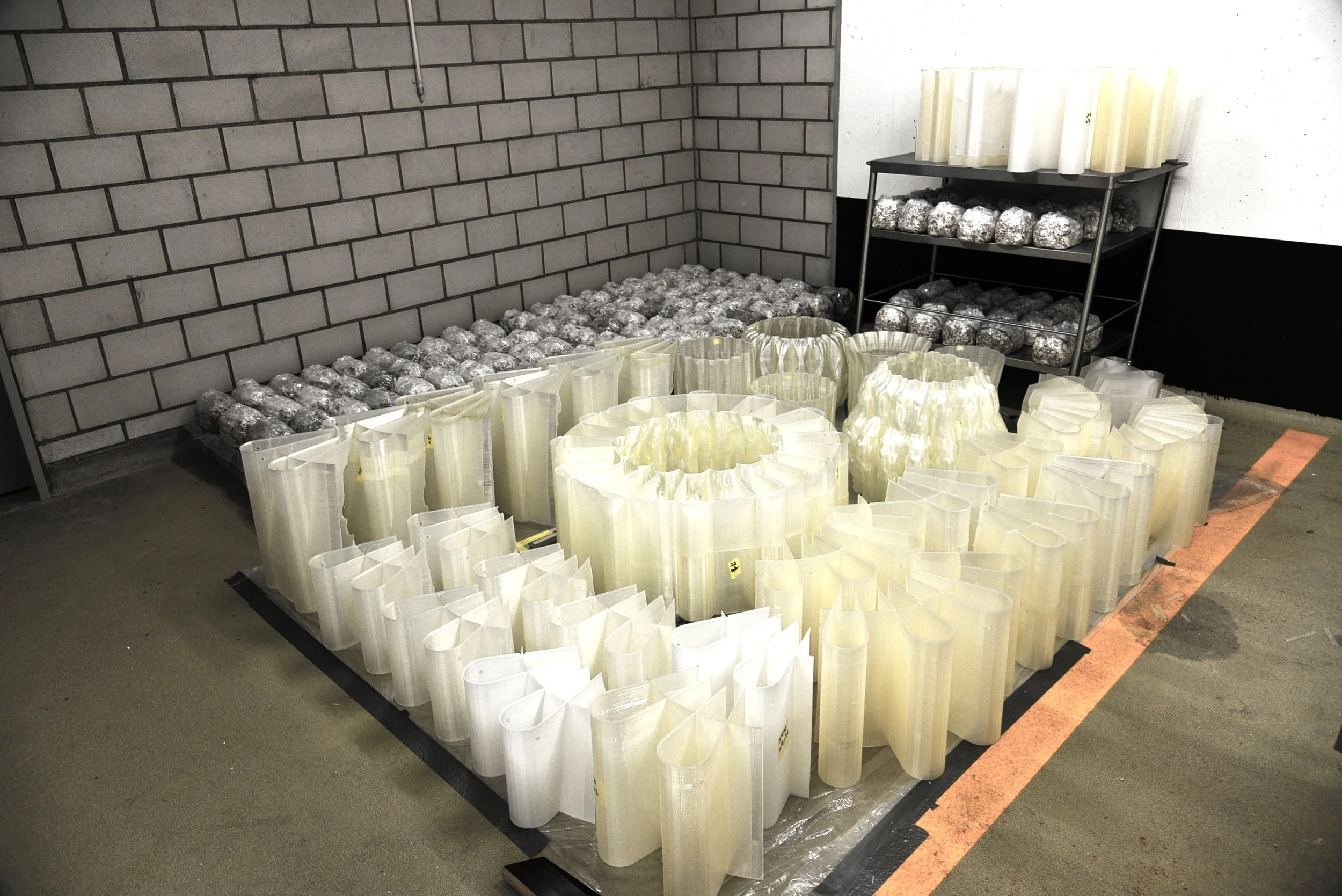 The formwork integrates features that optimize environmental conditions for mycelium cultivation. It provides shelter, nutrients and humidity, while simultaneously defining the structural geometry of the column. Once growth is complete, the formwork is dissolved in water and recycled, leaving behind a consolidated, load-bearing biopolymer.