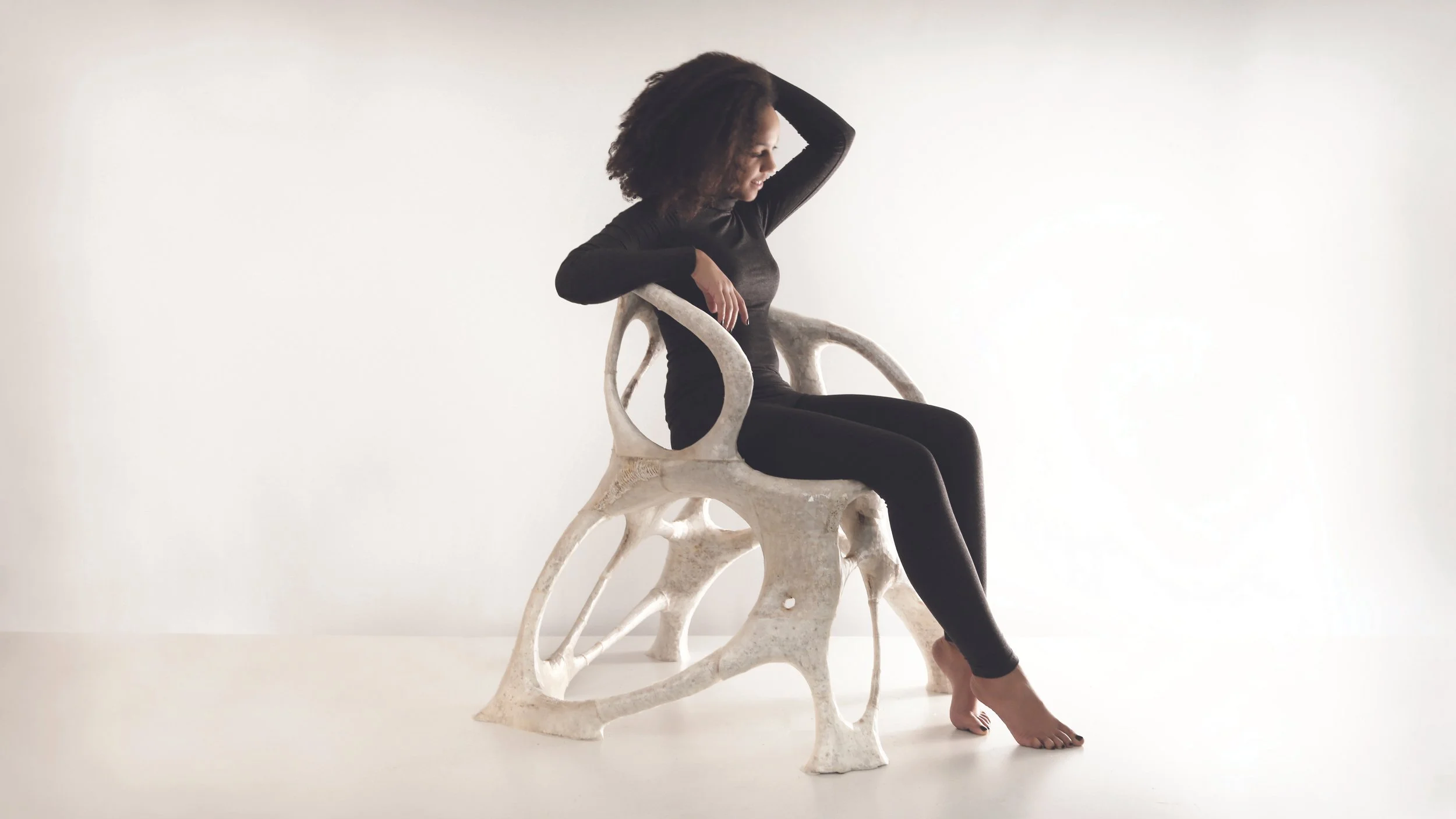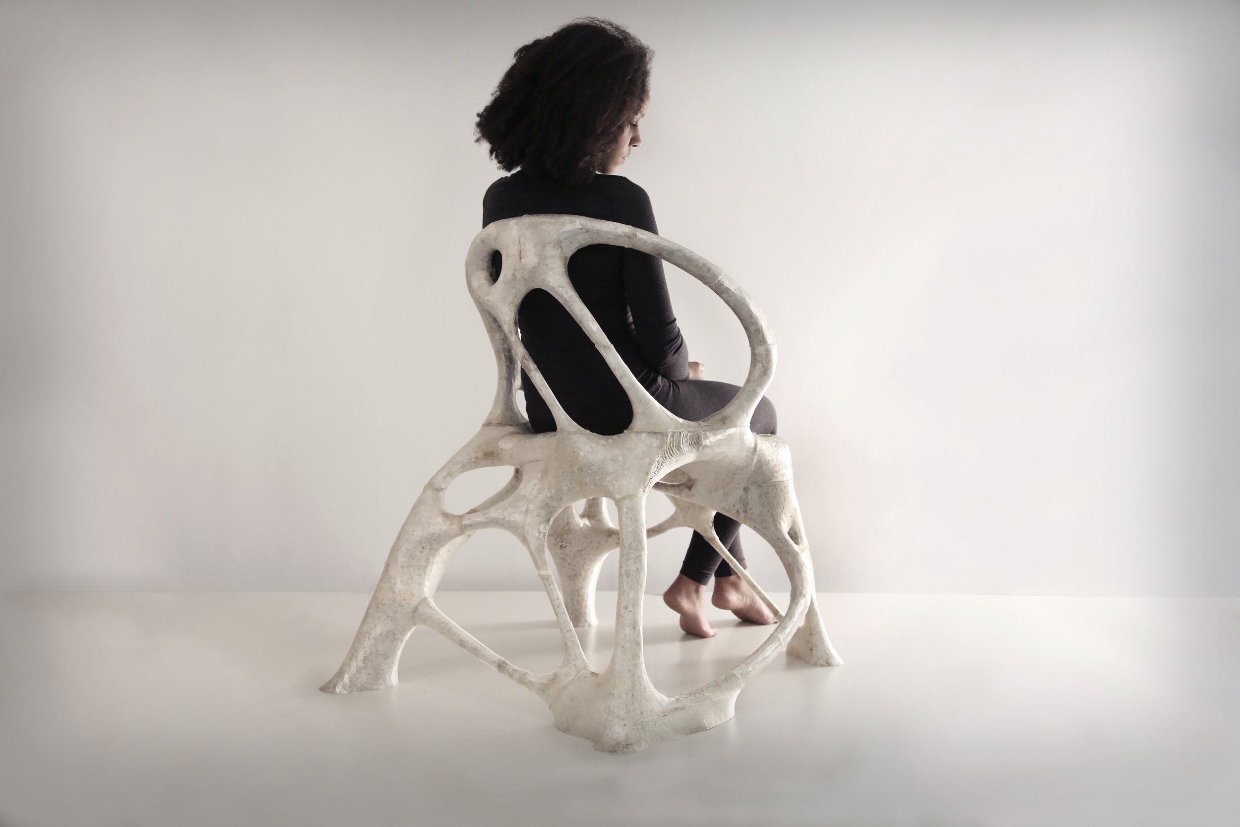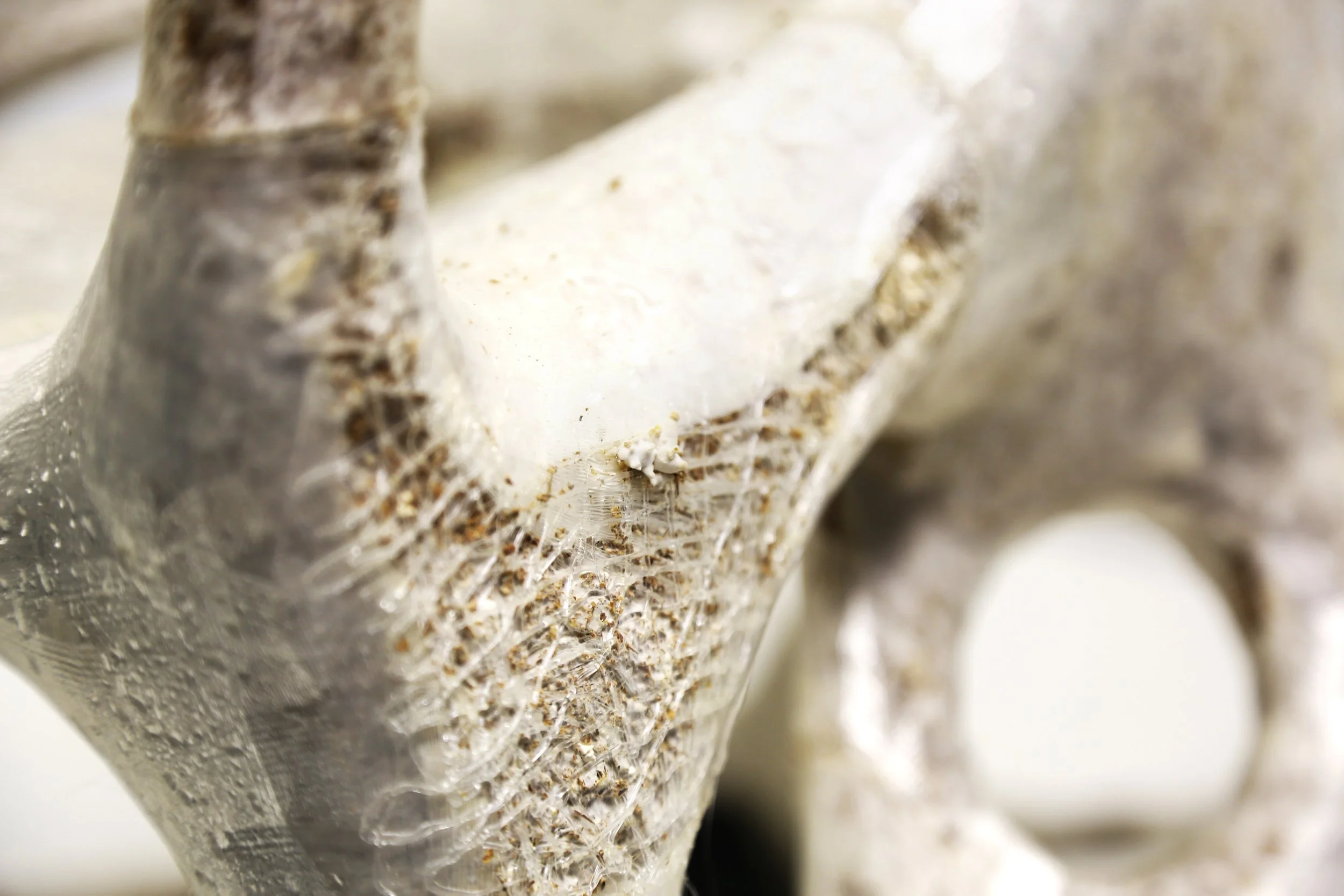 This project investigates how 3D-printed, thin-shell formwork can enable materially efficient bio-composite furniture. The chair is grown from a mycelium-bound substrate that is compacted into a custom-printed biodegradable formwork, which serves simultaneously as mold, moisture-regulating enclosure, and structural constraint during growth. The digitally generated formwork geometry minimizes material usage while ensuring even colonization and drying of the mycelium. After the growth phase, the bio based composite is dried to achieve structural stiffness, resulting in a lightweight, fully bio-based chair that demonstrates how computational formwork and mycelium-based fabrication can converge to produce functional, low-impact furniture.